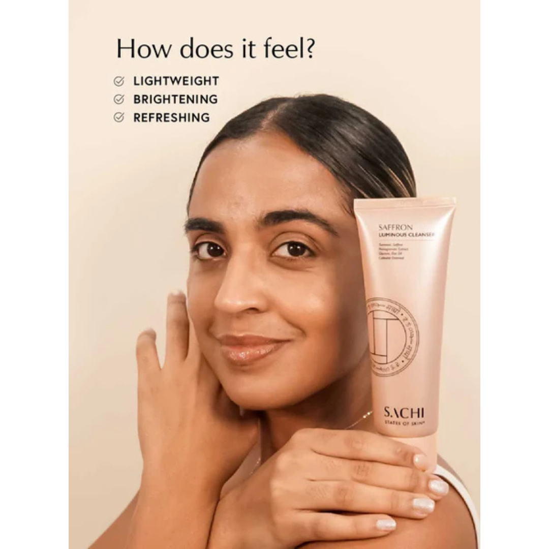 A: Our Saffron Luminous Cleanser offers versatility for all skin types as a standalone cleanser or part of a double cleansing routine. We prioritize responsibly sourcing ingredients and utilizing environmentally-friendly materials, such as FSC-certified materials and post-consumer recycled bottles. Our Ayurvedic botanicals are sourced from verified suppliers, and our packaging incorporates 50% Post Consumer Recycled materials. With each step, we're working to make a positive impact on both our communities and the planet, continually striving to do better as we progress on this journey toward sustainability.