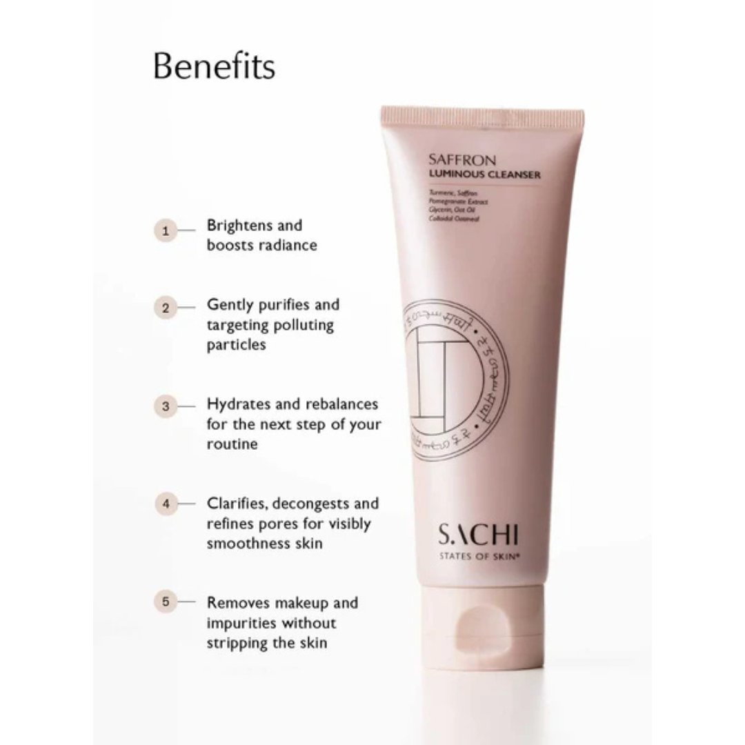 Saffron, an Ayurvedic super-ingredient, offers a myriad of medicinal benefits, including antioxidants and soothing properties, to calm, brighten, and nourish the skin. Enriched with turmeric, safflower oil, boswellia serrata extract, pomegranate extract, and lactic acid, this cleanser gently refines skin texture, brightens, purifies, and softens the skin, preparing it for subsequent skincare or makeup application.