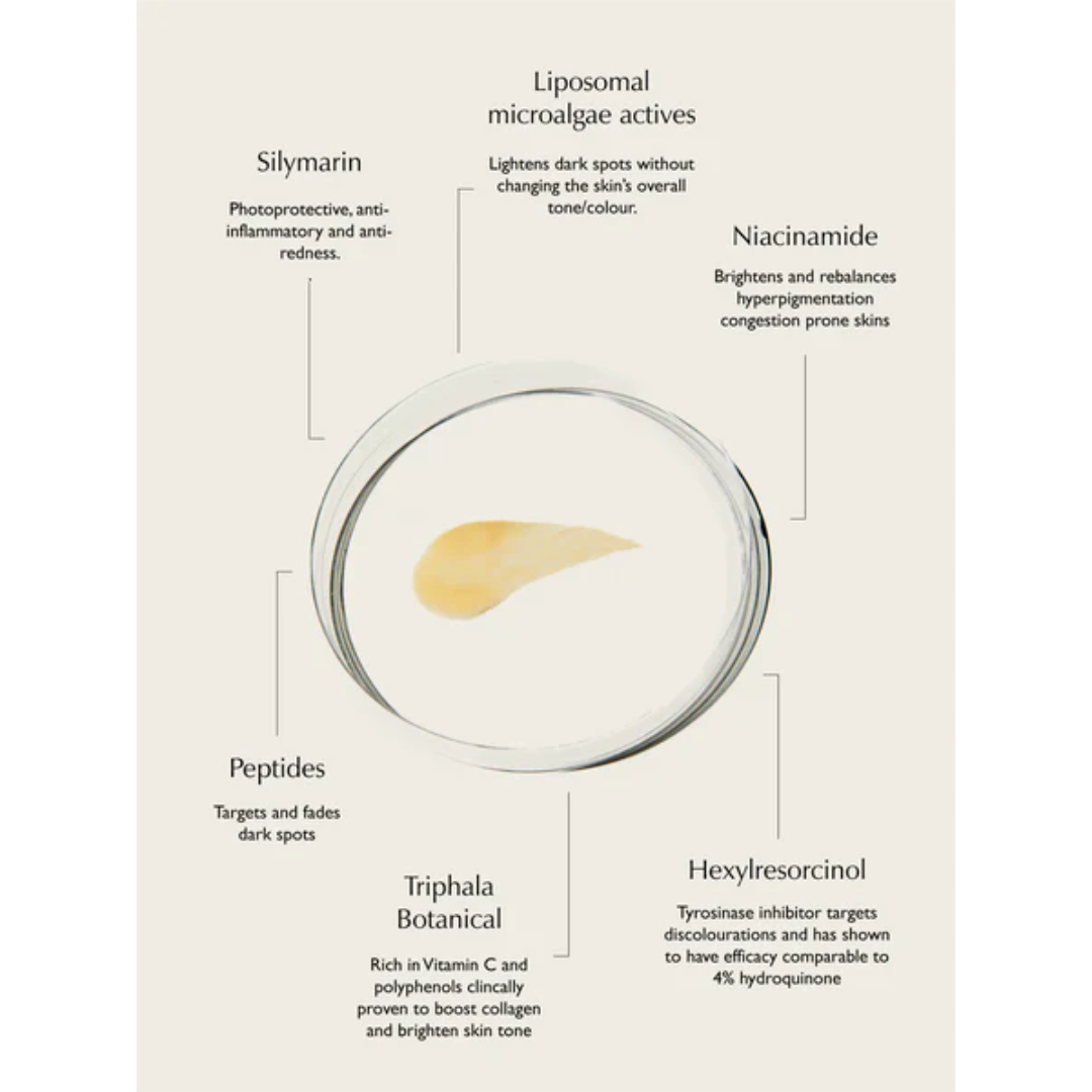 We understand the nuances that make up each skin tone and state. This novel, thoughtful formula is an innovative non-AHA/BHA, non-retinoid and non-hydroquinone system that targets hyperpigmentation while minimising irritation. We’ve created a unique serum that uses a multi-pathway approach to help fade stubborn hyperpigmentation, harnessing the healing properties of three ancient Ayurvedic superfruits (Emblica Officinalis, Terminalia Chebula & Terminalia Belerica blended into "Triphala") and twelve powerhouse brighteners, peptides, antioxidants and reparatives. When we say that this is for everyone, we mean it.